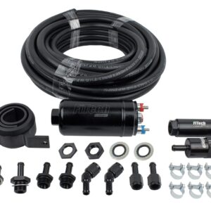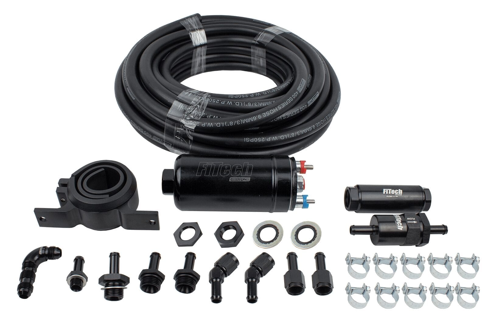 The Inline Fuel Pump Fuel Delivery Kit includes an EFI grade 255 L/PH inline external fuel pump that is suitable for engines making up to 600HP. (Note that some of our EFI kits are limited to less than 750HP due to maximum usable injector sizes). This kit also includes 40-feet of EFI grade fuel hose suitable for both the inlet and return lines between the fuel tank and the engine. The kit includes two billet fuel filters. The filters include a 60-micron pre-filter and a 30-micron post filter.