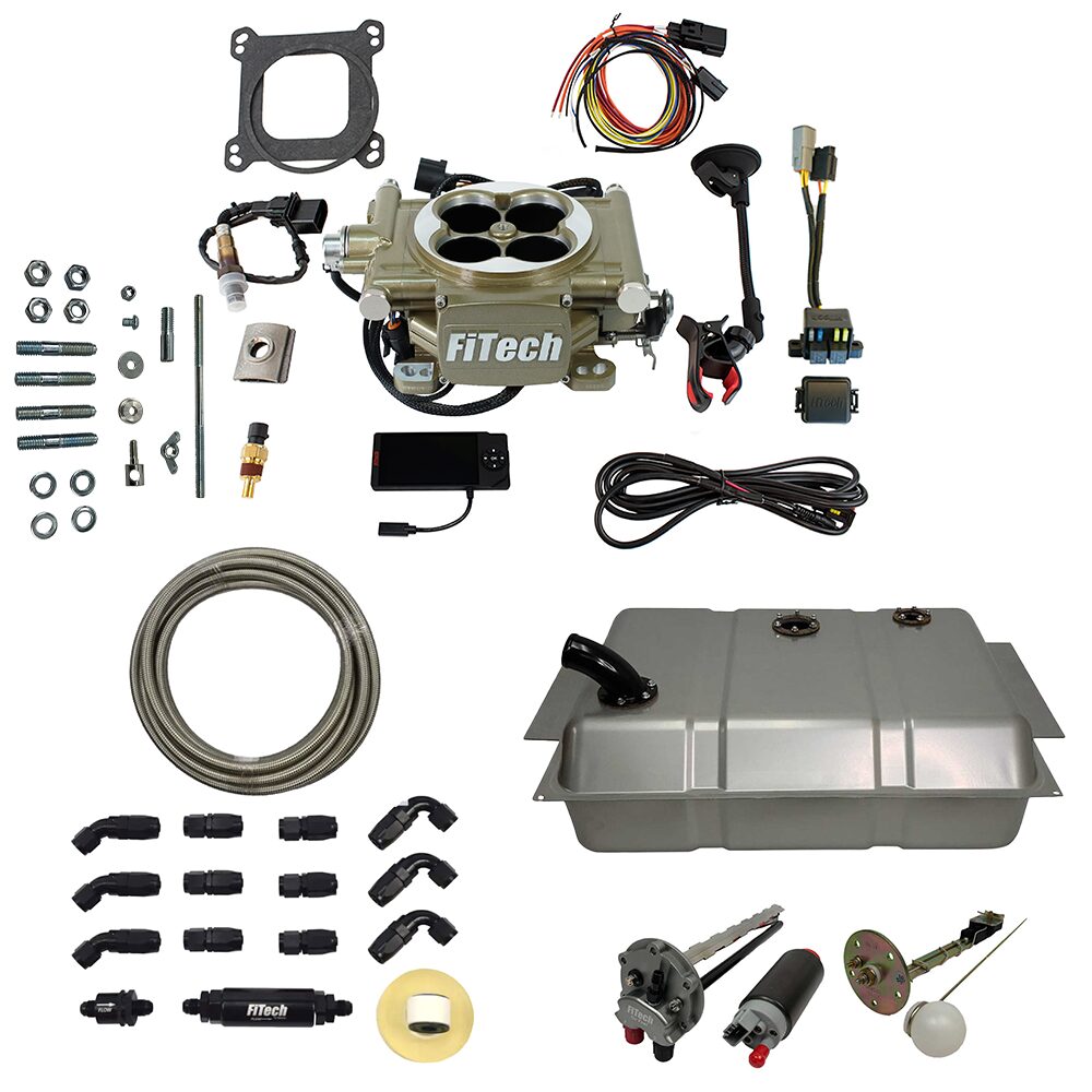 The new Total Package EFI swap kits feature FiTech’s proven Easy Street 600-horsepower throttle body as the heart of the system, delivering smooth and reliable performance. In addition, the kits include a new direct-fit fuel tank with an internal pump module, a high-pressure internal fuel pump, and a complete steel braided hose kit to get the fuel to the classic gold-finished throttle body. A high-flow serviceable filter and AN-style fittings are also included, making all of the connections for installation a breeze.