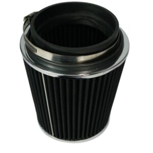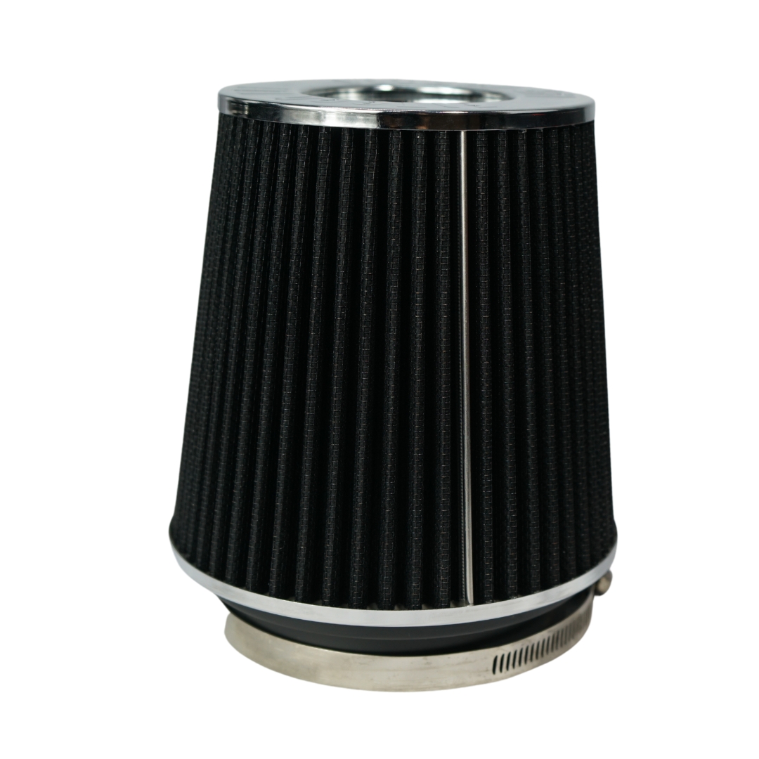 The 6-inch cone-shaped filter is capped on both ends with a show quality chrome housing securing the filter with a 4-inch inlet. A rubber coupler and robust clamp are supplied to seal over the flange of most 102mm throttle bodies creating a tight seal and secure mount. The cone shaped filter is capped on both ends with a show quality chrome housing and a heavy-duty clamp.