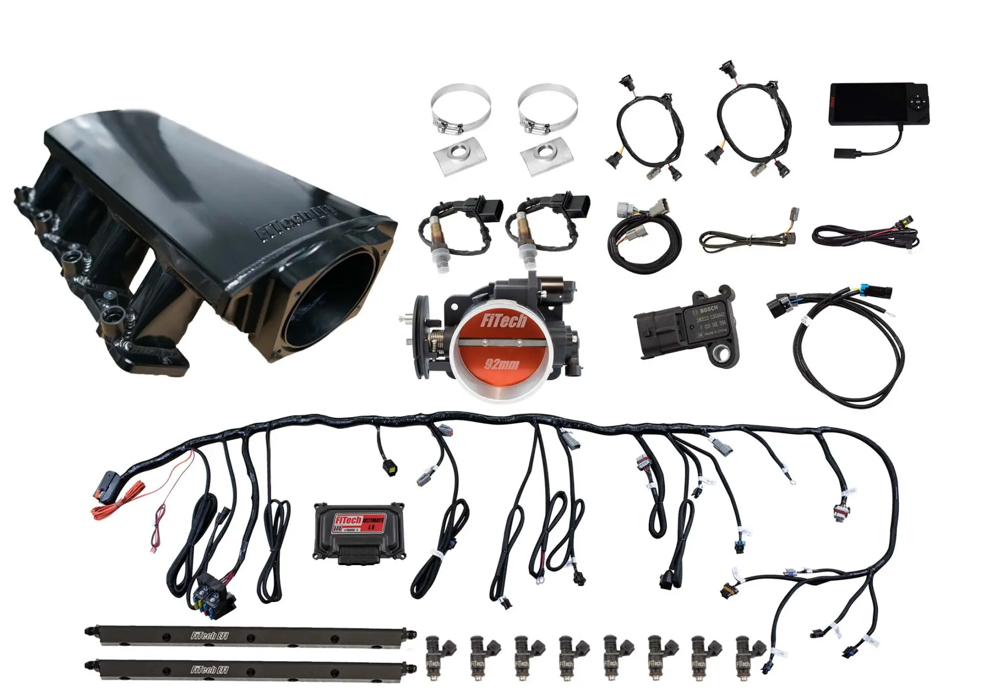 The Ultimate LS 500HP Kit with trans control for LS3/L92 (Part No: #70012) are a complete self-tuning induction systems for LS engines designed for the do-it-yourself hot rodder to the professional EFI tuner! This system is ready to go with everything needed to complete the induction system of your LS engine and get you on the road easily and faster than any system on the market today. Forget sourcing mismatched parts and cutting and splicing old harnesses and re-flashed ECU?s from ?Craigs List? tuners. FiTech?s Ultimate EFI is a complete Kit. Suitable for that junkyard 5.3 to a stroker 427, we have you covered! Check out the list of features and you will wonder why it?s never been so simple to ditch that old factory hardware or top off that fresh long block. We have taken the work out of getting your new or pull-out LS up and running in a flash. That?s why we call this kit the Ultimate EFI.