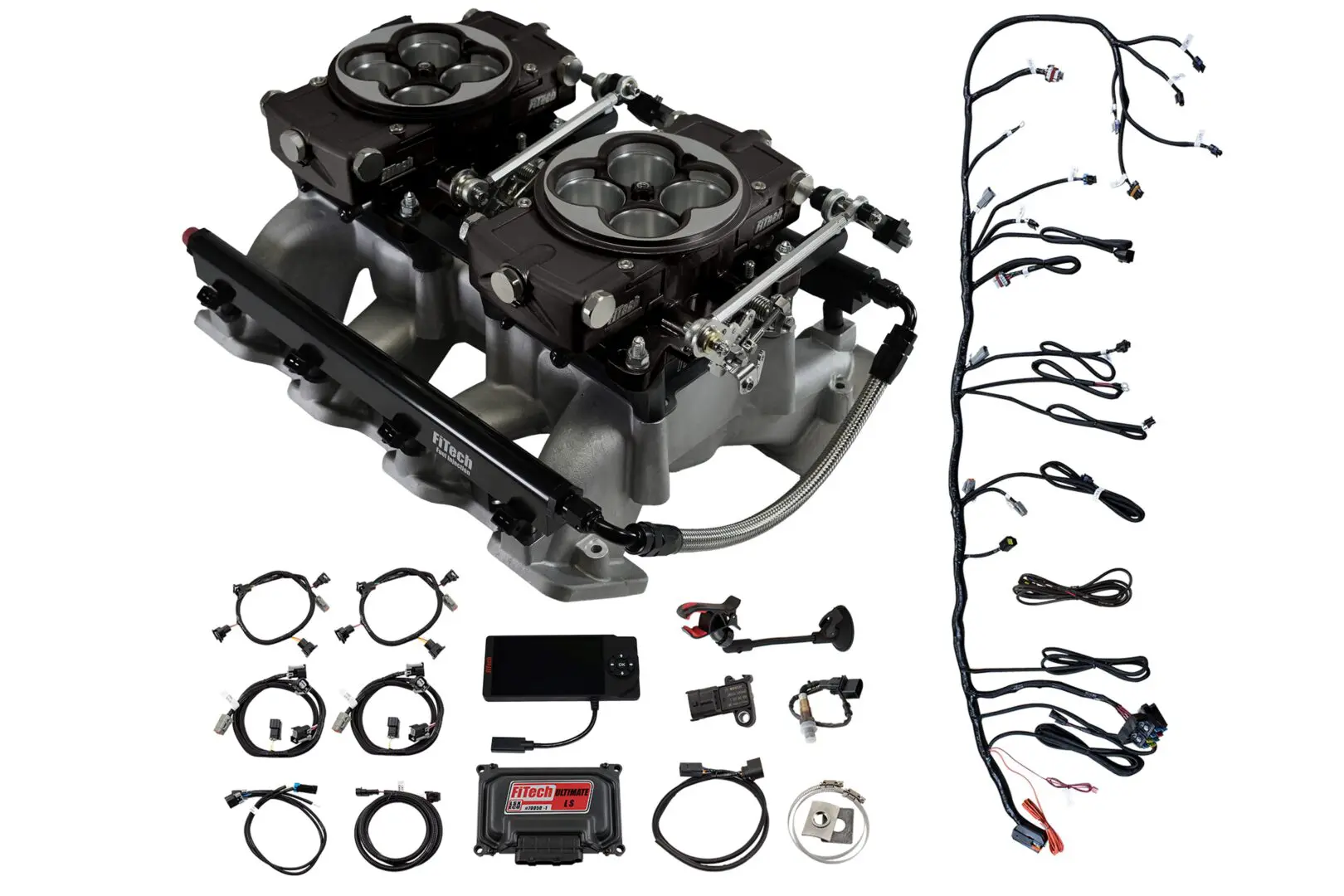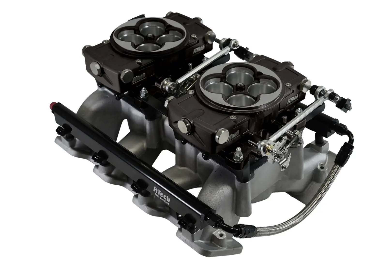 The FiTech Dual Quad Retro Cast LS Port EFI is suitable for up to 750HP. The throttle pulls from the center rather than the traditional side using a trick setup for the throttle linkage. This EFI is port injected and gives you all of the looks of a classic dual setup for your modern LS.