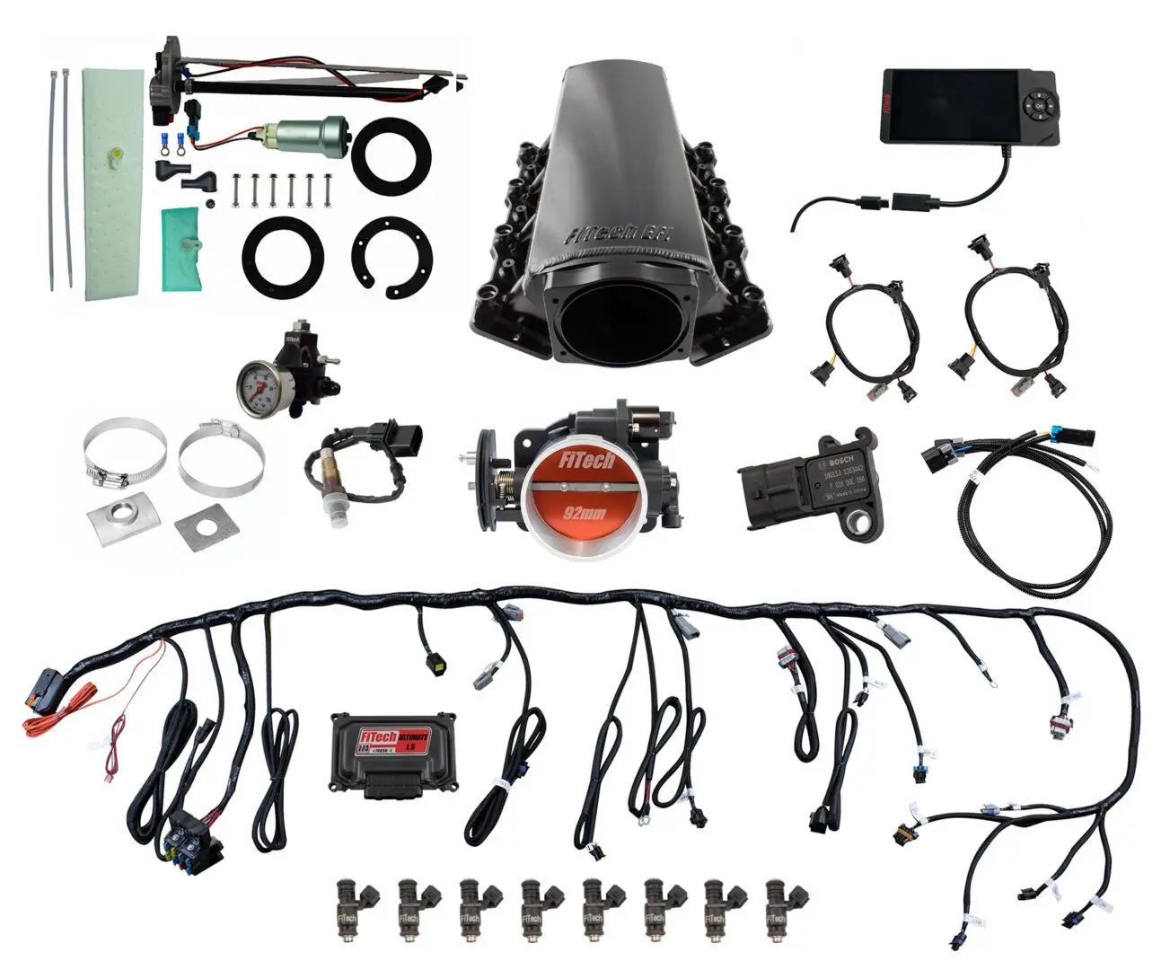 The Ultimate LS1/LS2/LS6 500HP Intake Manifold Kit with 92mm Throttle Body are a complete self-tuning induction systems for LS engines designed for the do-it-yourself hot rodder to the professional EFI tuner! This system is ready to go with everything needed to complete the induction system of your LS engine and get you on the road easily and faster than any system on the market today. Forget sourcing mismatched parts and cutting and splicing old harnesses and re-flashed ECU’s from “Craigs List” tuners. FiTech’s Ultimate EFI is a complete Kit. Suitable for that junkyard 5.3 to a stroker 427, we have you covered! Check out the list of features and you will wonder why it’s never been so simple to ditch that old factory hardware or top off that fresh long block. We have taken the work out of getting your new or pull-out LS up and running in a flash. That’s why we call this intake manifold kit the Ultimate EFI.